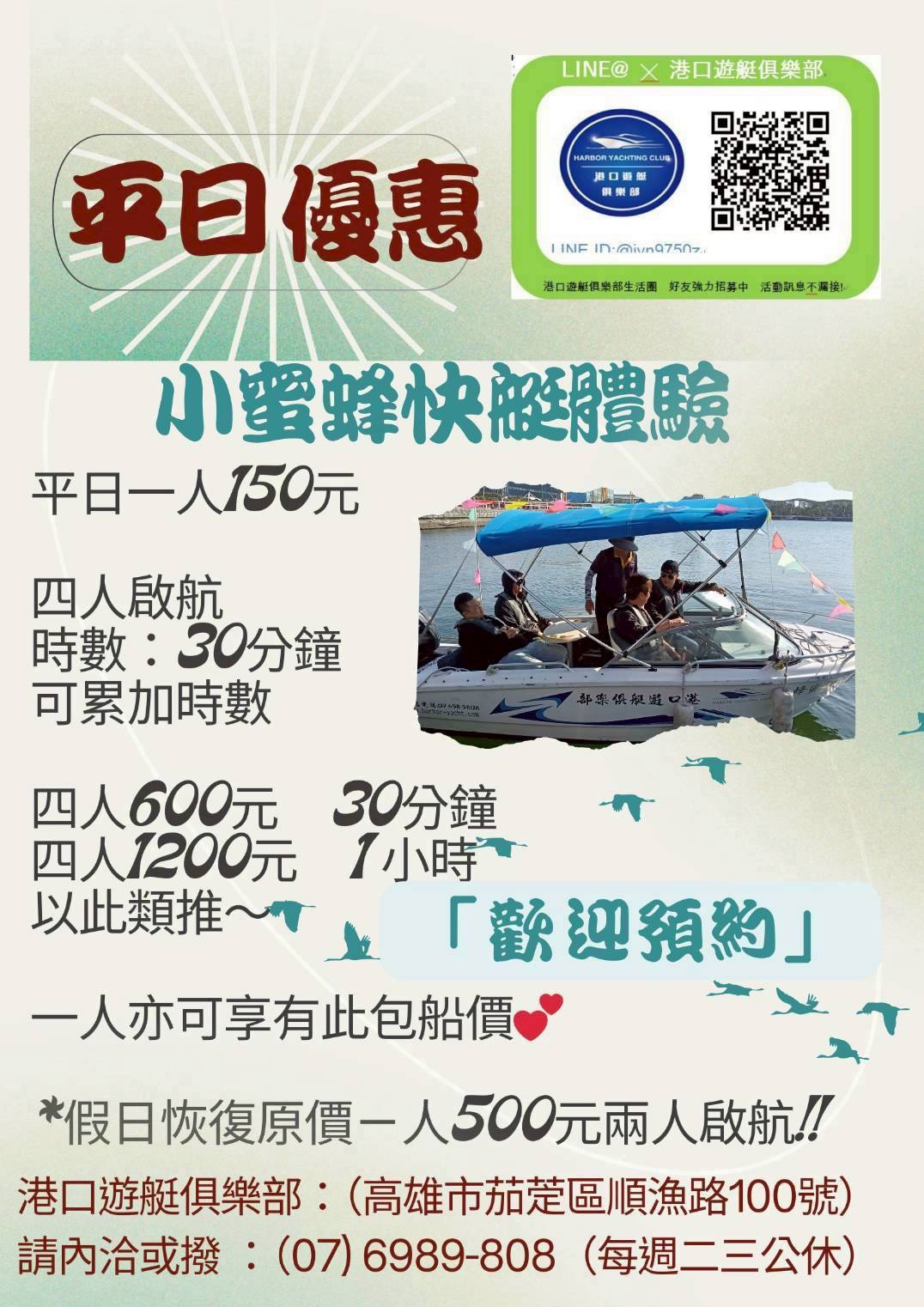 最新消息 News 小蜜蜂快艇[平日限定]活動‼️ 2025-11-21 小蜜蜂快艇[平日限定]活動 #一人30分鐘只要150元 #3+1位啟航600元 一位也可享此包船價喲 #包船最多4位 單位:以每半小時計算 30分 600元 1小時 1200元 以此類推 詳情請加港口遊艇俱樂部 官方line :@ivn9750z 或撥07-6989-808 由專員為您服務 (每週二.三公休) 相關附件 S__2899975.jpg 上一則 下一則